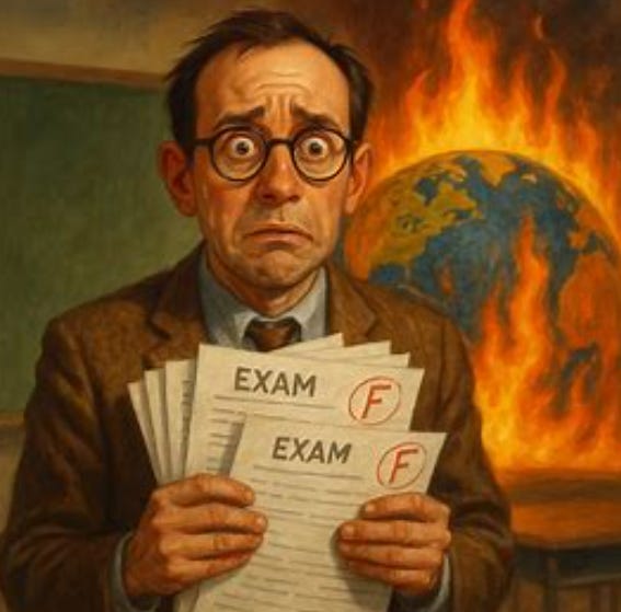 I normally don’t include the prompt here, but I liked this one: A teacher with glasses and wide eyes stands clutching a pile of exam papers. He looks worried. Behind him, blurry in the background, the world is on fire.